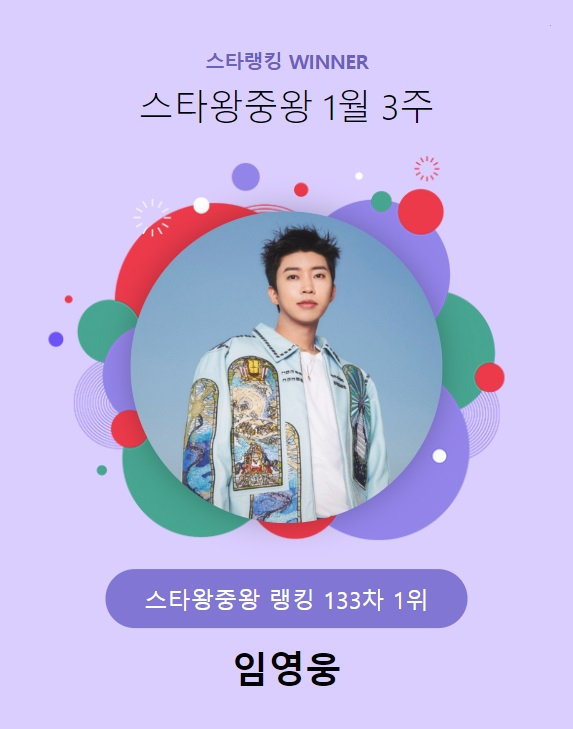 임영웅은 지난 17일 오후 3시 1분부터 24일 오후 3시까지 진행된 1월 3주(133차) 스타왕중왕 랭킹 투표에서 15만 9501표를 획득하고 1위를 수성했다.