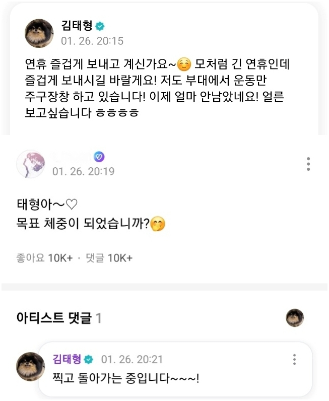 한 팬이 "목표체중이 되었냐"라고 질문하자 "찍고 돌아가는 중입니다"라고 답했다. 뷔는 입대를 앞두고 군에서 체력을 키워 나오겠다는 목표를 밝힌 바 있다.