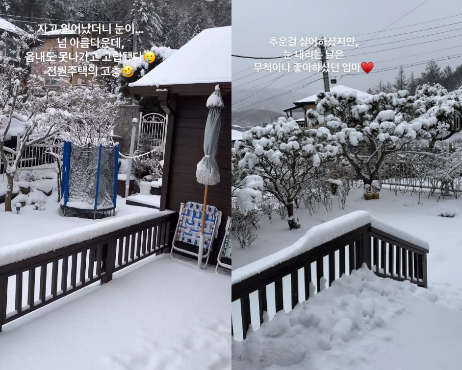 이어 "너무 아름다운데 읍내도 못 나가고 고립됐다. 전원주택의 고충"이라며 "추운 걸 싫어하셨지만, 눈 내리는 건 좋아하셨던 엄마"라고 고 김수미를 떠올렸다.
