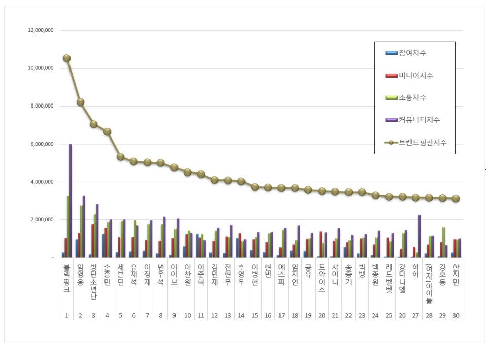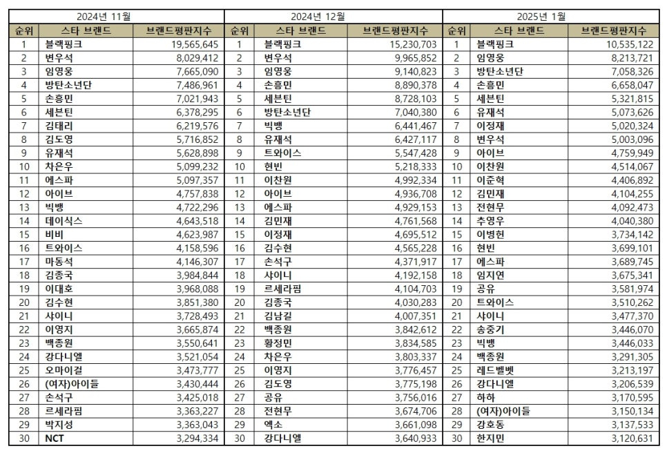 2025년 1월 스타 브랜드평판 30위 순위는 블랙핑크, 임영웅, 방탄소년단, 손흥민, 세븐틴, 유재석, 이정재, 변우석, 아이브, 이찬원, 이준혁, 김민재, 전현무, 추영우, 이병헌, 현빈, 에스파, 임지연, 공유, 트와이스, 샤이니, 송중기, 빅뱅, 백종원, 레드벨벳, 강다니엘, 하하, (여자)아이들, 강호동, 한지민 순으로 분석됐다.