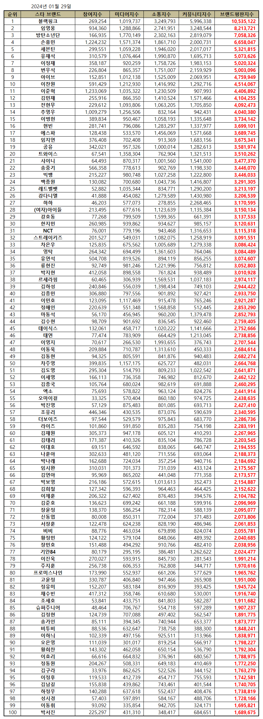 스타 브랜드평판 2025년 1월 빅데이터 분석 100위는 블랙핑크, 임영웅, 방탄소년단, 손흥민, 세븐틴, 유재석, 이정재, 변우석, 아이브, 이찬원, 이준혁, 김민재, 전현무, 추영우, 이병헌, 현빈, 에스파, 임지연, 공유, 트와이스, 샤이니, 송중기, 빅뱅, 백종원, 레드벨벳, 강다니엘, 하하, (여자)아이들, 강호동, 한지민, NCT, 스트레이키즈, 차은우, 영탁, 유연석, 류현진, 박지현, 르세라핌, 김하성, 김종민, 이민호, 정해인, 마동석, 김수현, 데이식스, 태연, 이영지, 이동욱, 김동현, 차주영, 김도영, 이세영, 김종국, 엑소, 오마이걸, 박진영, 조유리, 더보이즈, 라이즈, 김재원, 김태리, 이대호, 나훈아, 박나래, 임시완, 김연아, 박보영, 김희철, 이제훈, 김준호, 장윤정, 신동엽, 서장훈, 비비, 황정민, 장민호, 기안84, 이진욱, 주지훈, 프로미스나인, 고윤정, 정유미, 채수빈, 조세호, 슈퍼주니어, 김정현, 송가인, 비투비, 이하늬, 오은영, 황희찬, 이효리, 정동원, 김구라, 이정후, 김남길, 하정우, 성시경, 이동휘, 박서진 순으로 분석됐다.