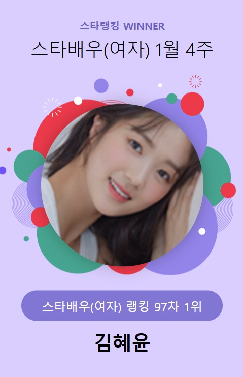 김혜윤은 지난 23일 오후 3시 1분부터 30일 오후 3시까지 진행된 1월 4주(97차) 스타랭킹 스타배우 남자 랭킹 투표에서 2만 693표를 얻고 1위에 이름을 올렸다.