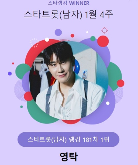 영탁은 지난 23일 오후 3시 1분부터 30일 오후 3시까지 진행된 1월 4주(181차) 스타랭킹 스타트롯 남자 랭킹 투표에서 1위를 차지했다.
