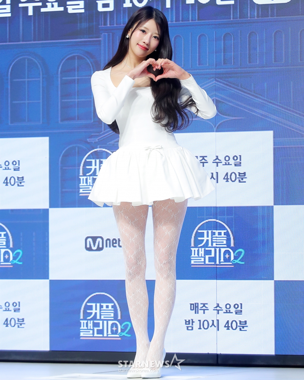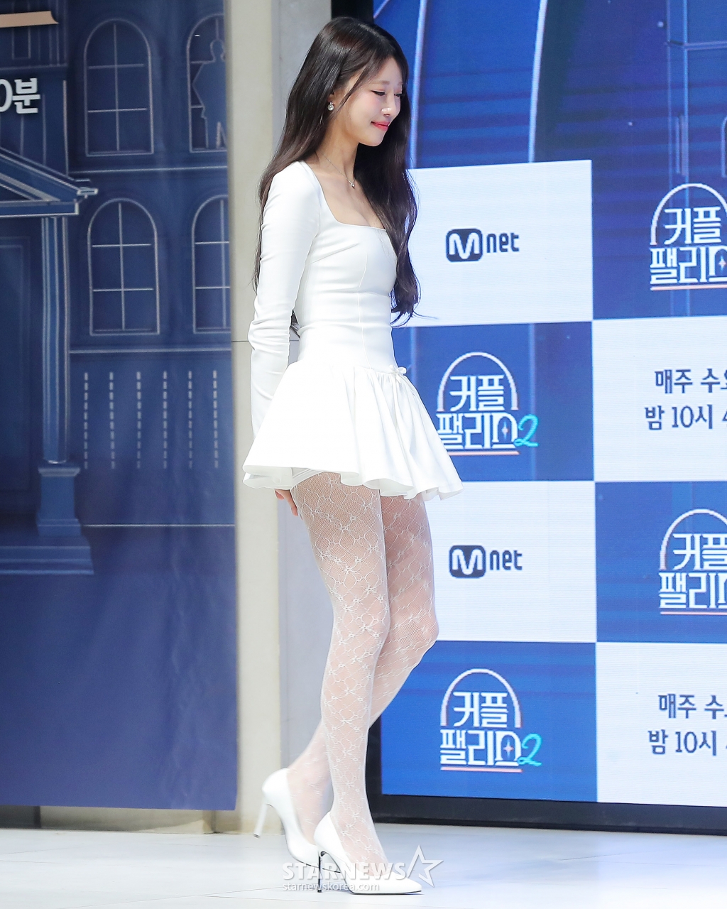 가수 미주가 4일 오전 서울 강남구 논현동 엘리에나호텔에서 진행된 엠넷 예능 '커플팰리스2' 제작발표회에 참석해 포즈를 취하고 있다.