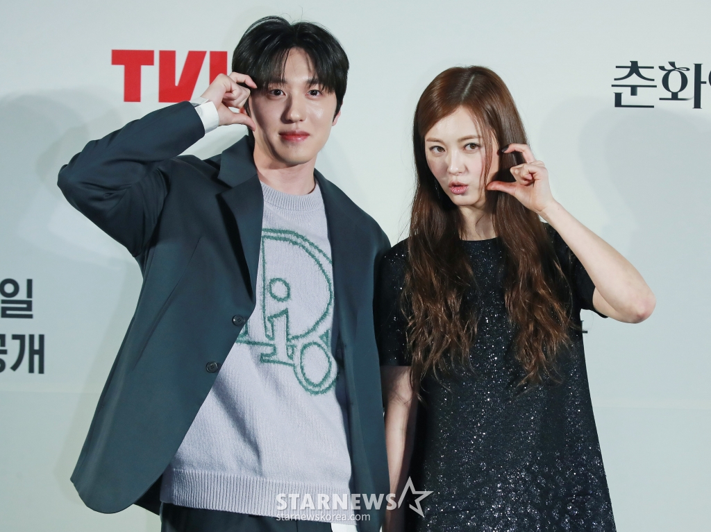 배우 강찬희, 고아라가 5일 오후 서울 CGV용산아이파크몰에서 진행된 티빙 오리지널 시리즈 '춘화연애담' 제작발표회에 참석해 포즈를 취하고 있다.