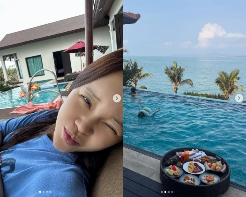 백지영은 6일 오후 개인 SNS에 "동남아시아 풀빌라 이침 식사 국룰. 개인 수영장에서 물 위에 살포시 띄운 아침 식사라니. 너흰 놀아라. 난 광합성 좀 하련다!!! #아침식사중 #신나는광합성"이라며 셀카 여러 장을 게재했다.