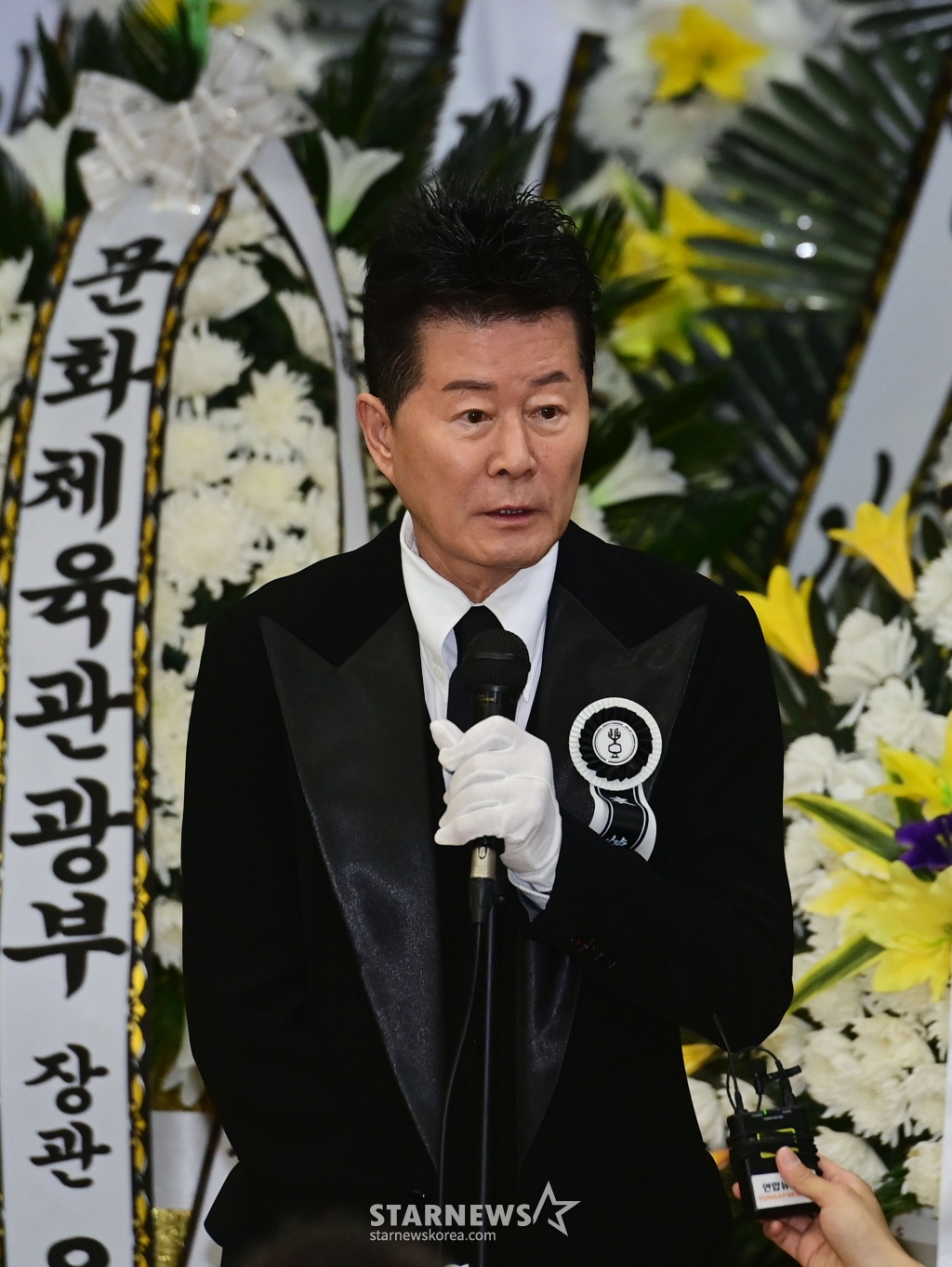 이날 태진아는 추도사 낭독을 위해 마이크를 잡았다. 그는 "무슨 말을 할까 생각을 많이 했습니다"라며 "저는 형님이 부럽기도 하고 자랑스럽기도 했다. 형님은 항상 저한테 멘토였다. '형 가는 길만 따라오면 너는 다 잘 되는 것이여, 알았지, 동생?' 하셨다. 그래서 진짜 따라갔다"라고 떠올렸다.