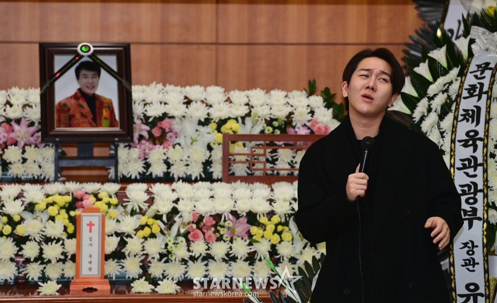 고인의 '영원한 라이벌', 태진아는 애써 덤덤하게 추도사를 읊었다. 그는 "무슨 말을 할까 생각을 많이 했습니다"라고 말문을 연 뒤 "저는 형님이 부럽기도 하고 자랑스럽기도 했다. 형님은 항상 저한테 멘토였다. '형 가는 길만 따라오면 너는 다 잘 되는 것이여, 알았지, 동생?' 하셨다. 그래서 진짜 따라갔다"라고 떠올렸다.