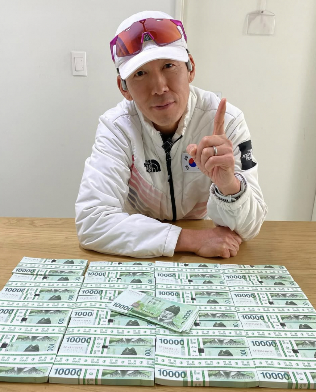 공개된 사진 속 션은 책상 앞에 2025만 원의 현금을 1만 원권으로 펼쳐둔 채 카메라 앞에 검지손가락을 치켜들고 있다.