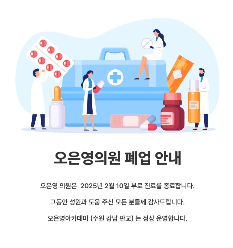 11일 오은영 의원 공식 홈페이지에는 "오은영 의원은 2025년 2월 10일 부로 진료를 종료합니다. 그동안 성원과 도움 주신 모든 분들께 감사드립니다. 오은영 아카데미(수원 강남 판교)는 정상 운영합니다"라고 공지글이 올라왔다.