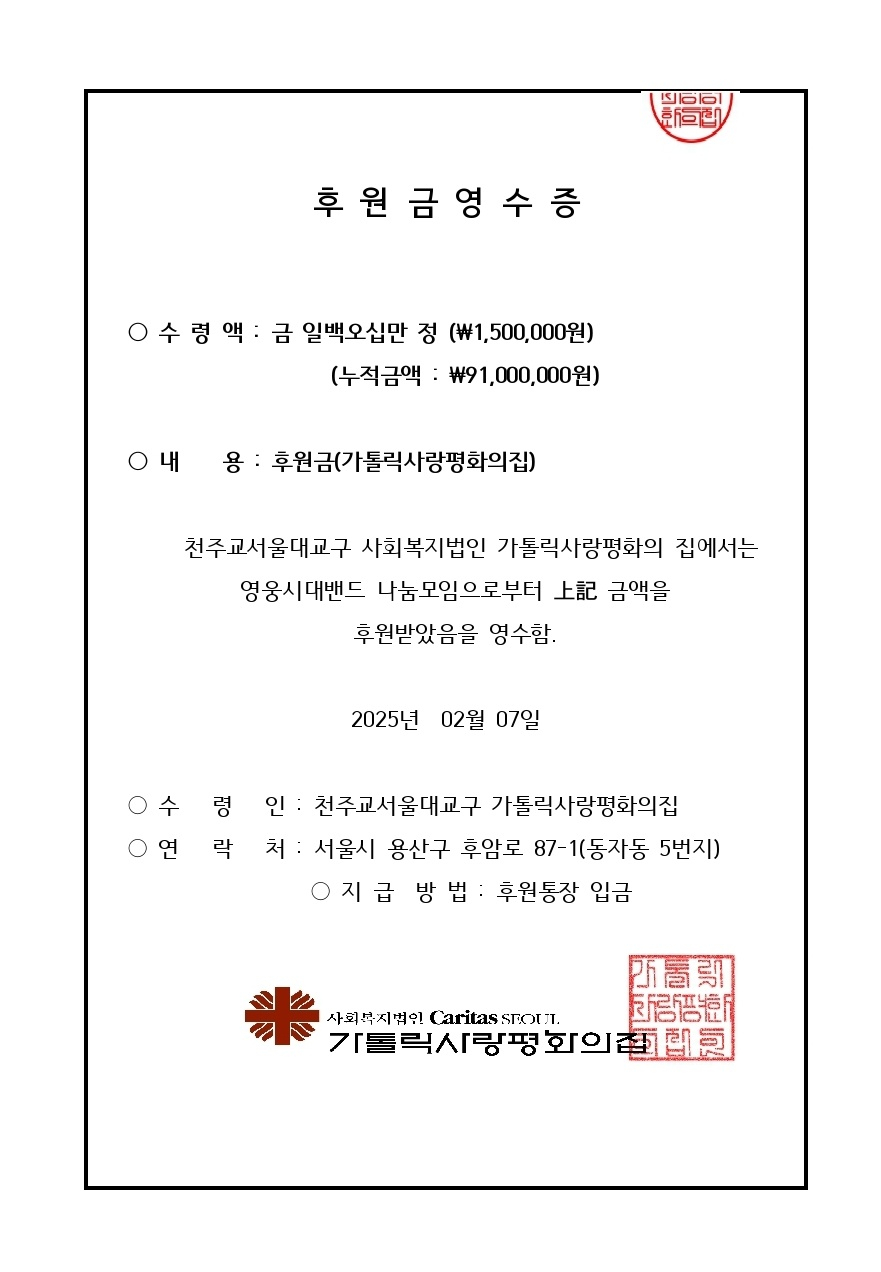 영웅시대밴드(나눔 모임)의 가톨릭사랑평화의집 누적 후원 총액은 9100만 원에 달한다.