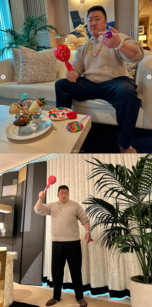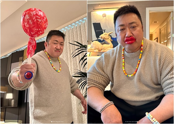 또 마동석은 입술 모양 사탕을 입에 물고 귀여운 분위기를 연출하고 있다.