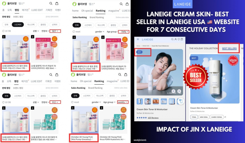 진이 글로벌 캠페인 중인 라네즈(LANEIGE) 크림스킨은 일본 온라인 쇼핑몰 큐텐(Qoo10)의 전체 카테고리에서 판매 랭킹 1위를 차지했다. 뷰티 한정이 아닌 전체 카테고리에서 1위는 최고 글로벌 슈퍼스타 진의 폭발적인 인기와 파워를 입증했다.