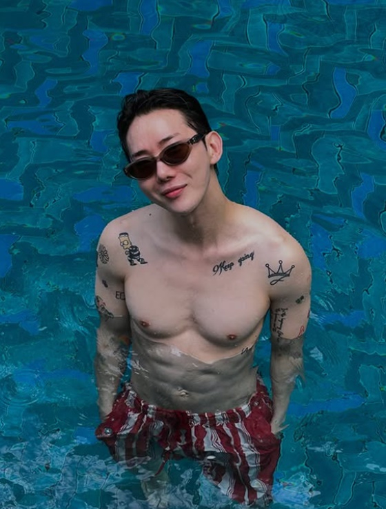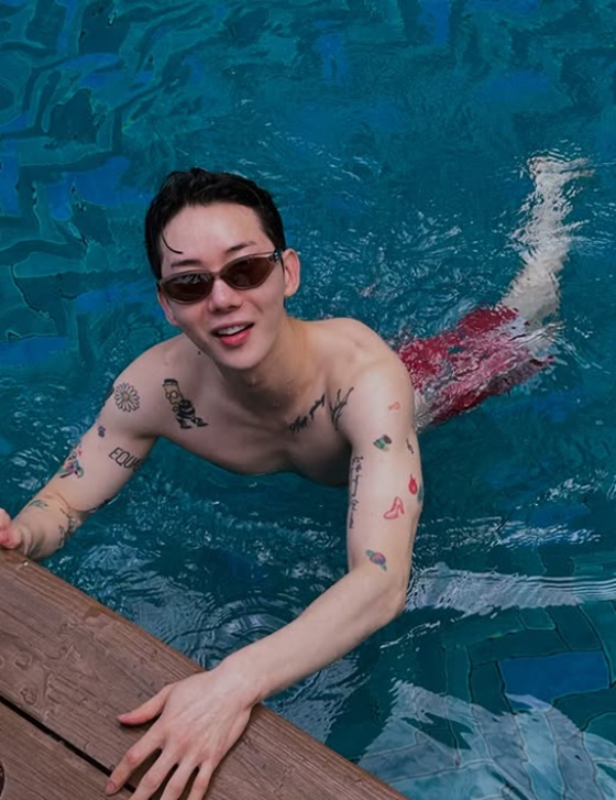 조권은 상의를 탈의한 채 야외 수영장에서 여유로운 시간을 보내고 있다. 특히 그의 탄탄한 상반신에는 여러 타투들이 새겨져 있어 눈길을 끌었다.