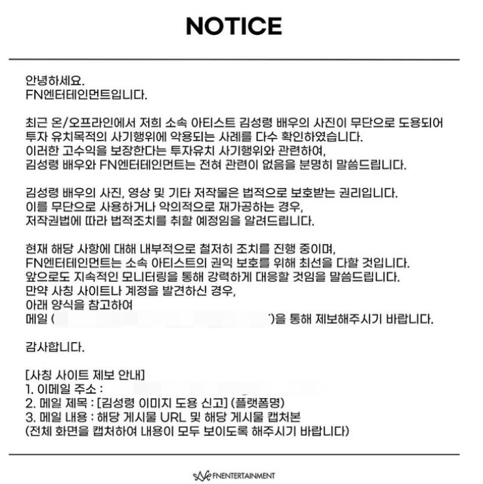 이에 따르면 FN엔터테인먼트는 "최근 온, 오프라인에서 김성령 배우의 사진이 무단으로 도용돼 투자 유치 목적의 사기행위에 악용되는 사례를 다수 확인했다"라며 김성령과 FN엔터테인먼트는 전혀 관련이 없다"라고 전했다.
