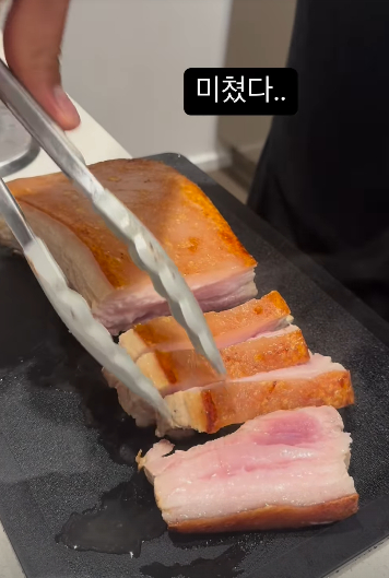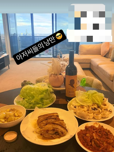 사진 속 세 사람은 삼겹살과 와인 등 여러 맛있는 음식과 함께 휴식을 취하고 있다.
