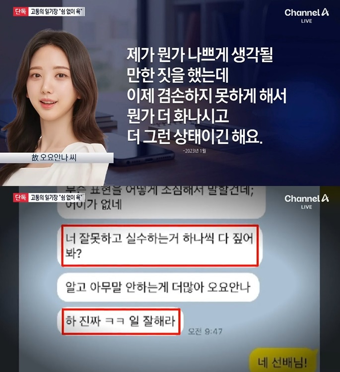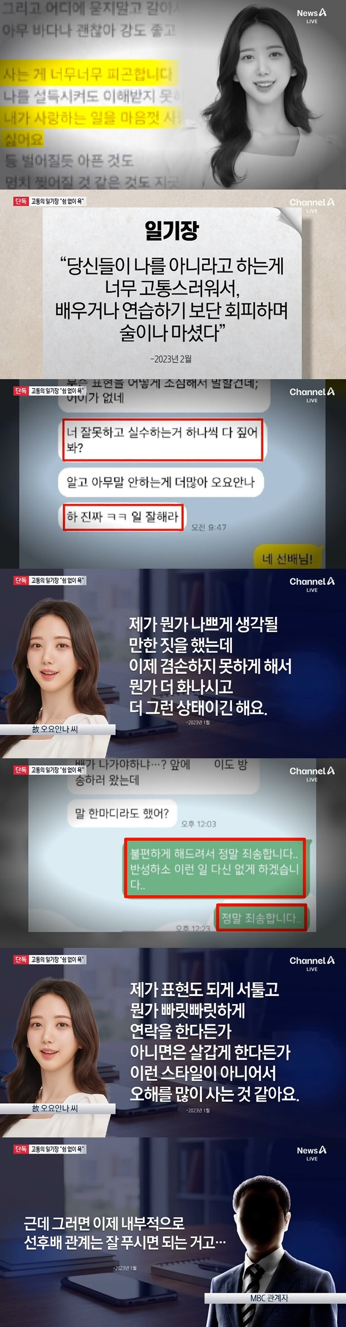 고 오요안나가 2023년 2월 쓴 일기장 내용에는 "선배들이 내 잘못을 샅샅이 모아 윗선에 제출했고, 카톡방에서 쉴 새 없이 날 욕했다", "당신들이 나를 아니라고 하는 게 너무 고통스러워서, 배우거나 연습하기보단 회피하며 술이나 마셨다"라고 적혀 있었다.