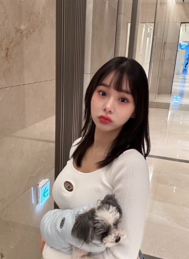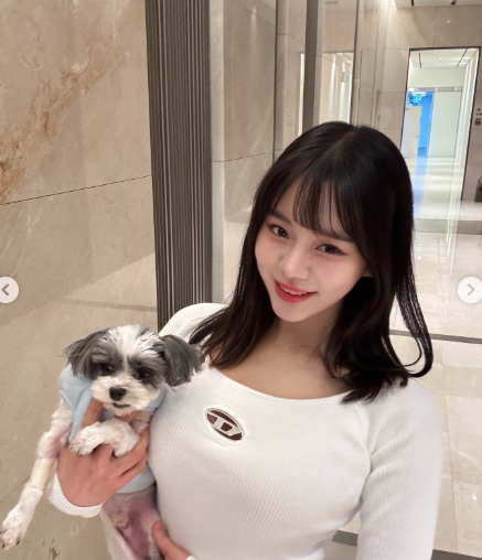 사진에서 맹승지는 반려견을 품고 있다.