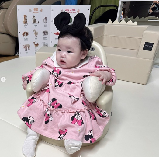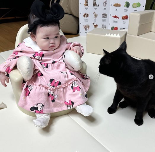공개된 사진 속에는 박수홍과 똑 닮은 붕어빵 딸 재이가 미니 마우스 머리띠를 쓰고 귀여운 원피스를 입고 있다. 크고 맑은 눈망울과 뽀얀 피부가 눈길을 끈다. 또 반려묘 다홍과의 케미가 너무나 귀엽다.
