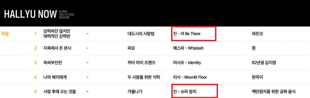 한편 진은 한국국제문화교류진흥원(KOFICE)이 발행하는 매거진 한류나우(Hallyu Now) 'KOFICE 해외특파원이 선정한 2024년 최고의 한류콘텐츠 5선'에서 솔로 앨범 '해피'(Happy)의 선공개곡 '아일 비 데어'(I'll Be There)로 독일 1위와 자작곡 '슈퍼 참치'(Super tuna)로 5위를 차지, TOP5 안에 1위와 5위로 두 곡을 올렸다.