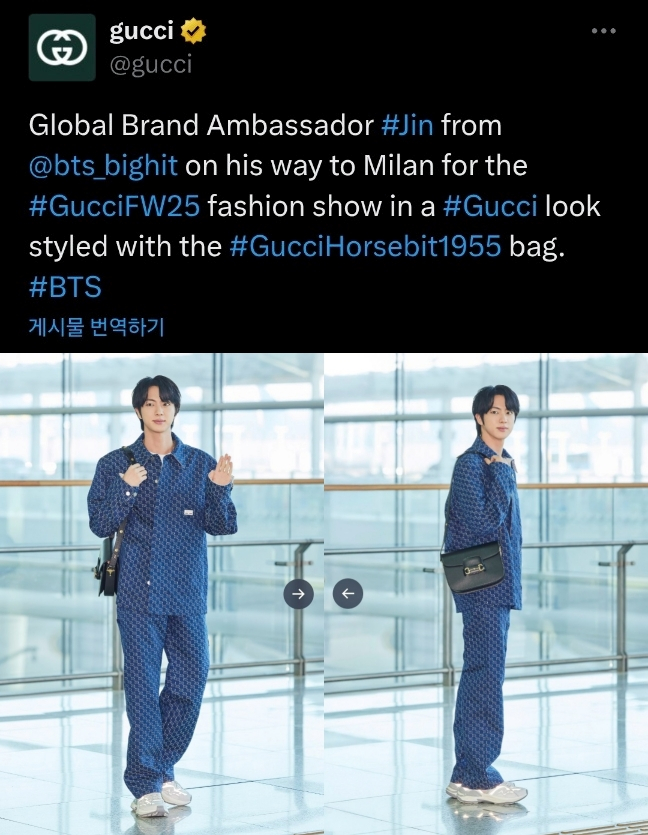 구찌는 X(엣 트위터) 등 공식 SNS를 통해 완벽한 비주얼을 가진 진의 출국 사진과 함께 "Gucci FW25 패션쇼를 위해 밀라노로 가는 글로벌 브랜드 앰버서더 진이 구찌의 룩을 입었습니다"라는 글을 남기며 '구찌의 얼굴' 진을 향한 애정을 드러냈다.
