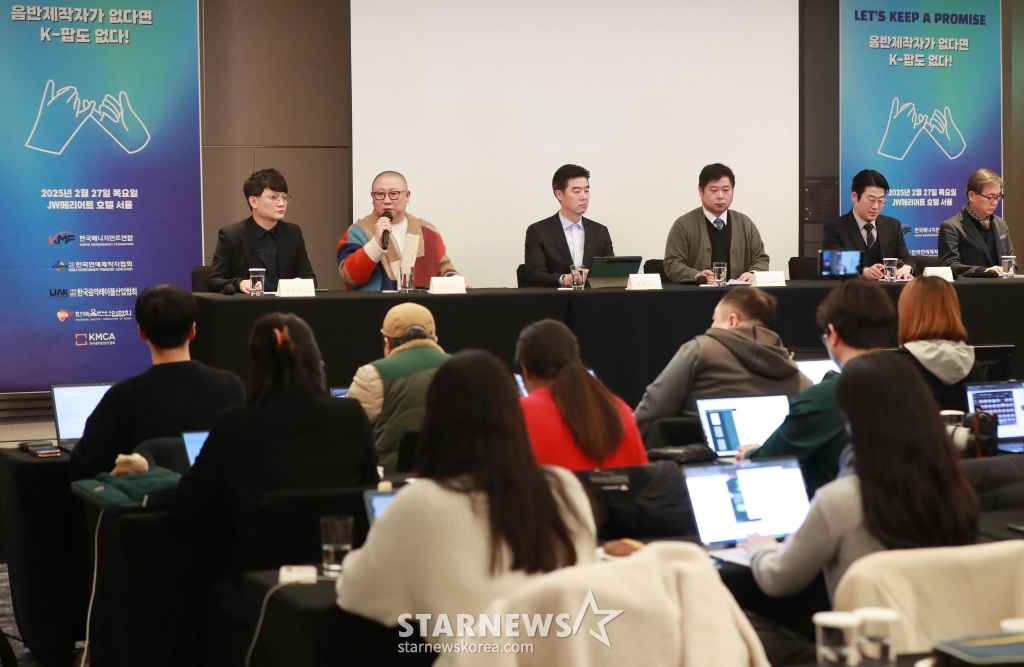 27일 오전 반포동 JW메리어트 호텔에서 ‘Let’s keep a promise : 음반제작자가 없다면 K-팝도 없다!’라는 주제로 진행된 음악산업의 공정한 권리 보호를 위한 음반제작자 기자회견에서 한국음악콘텐츠협회 최광호 사무총장, F&F 엔터테인먼트 최재우 대표, 한국연예제작자협회 김명수 본부장, 한국매니지먼트 이남경 국장, 한국음악레이블산업협회 신종길 국장, 헤럴드 경제 서병기 기자(왼쪽부터)가 종합토론을 하고 있다. /2025.02.27