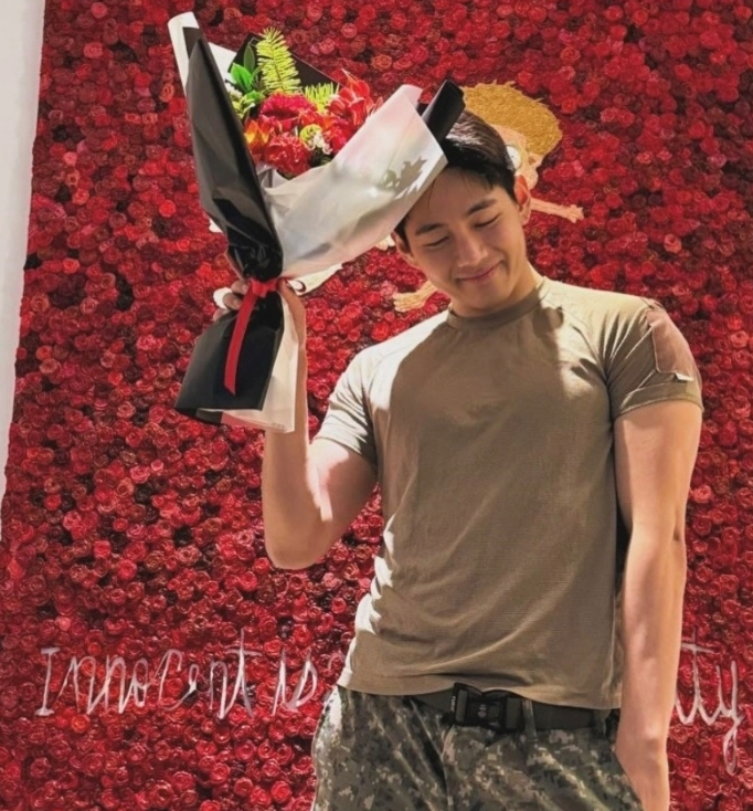 뷔는 지난 23일 "김병장 생존신고하러 왔습니다.! D-107입니다"라는 글과 함께 근황을 전하며 여러 장의 사진을 게재했다.