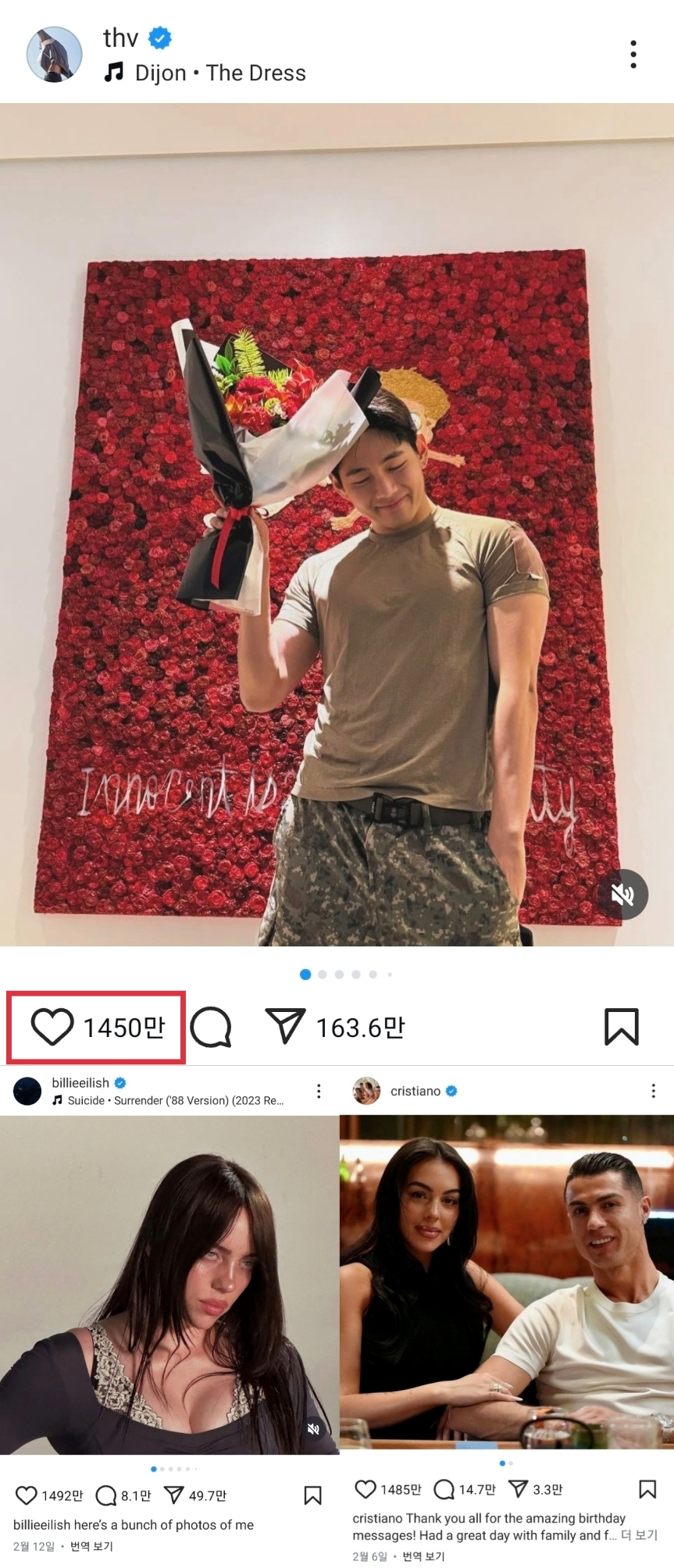 뷔는 지난해 '2024년도 인스타그램 '좋아요' 톱 12'에 5개의 개인 게시물이 순위에 올라 최다 '좋아요'를 기록했으며 단체 사진 등 총 6개의 게시물에 등장해 전 세계에서 대중들에게 가장 많은 사랑을 받는 스타에 등극했다.