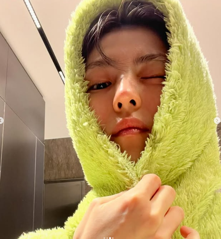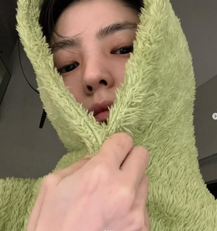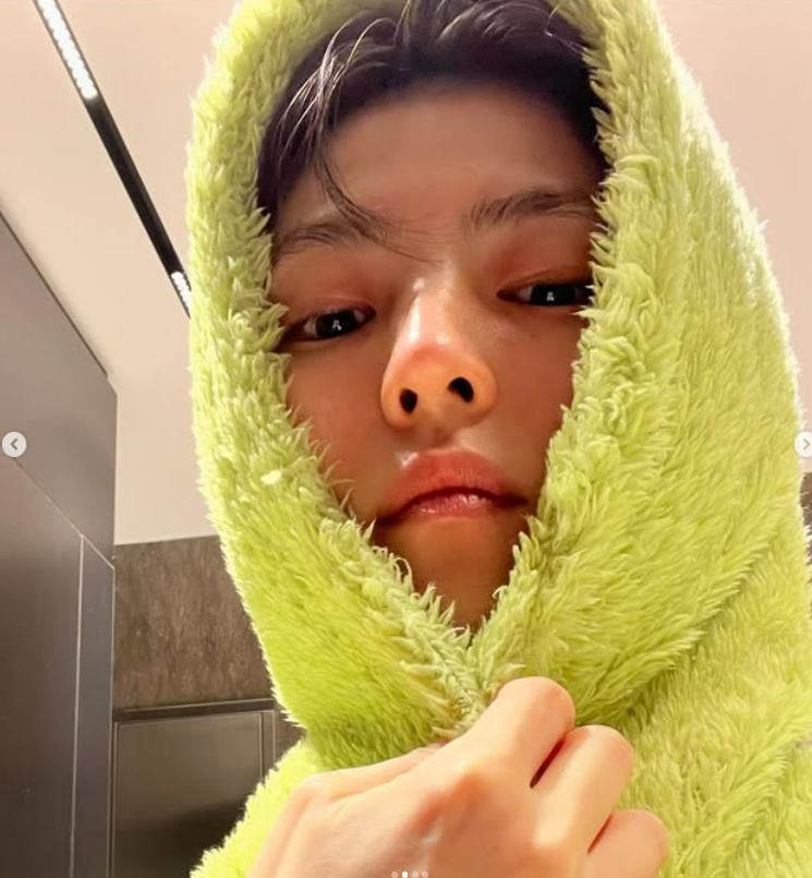 사진 속 한소희는 연두색 타올을 둘러쓴 모습이었다.