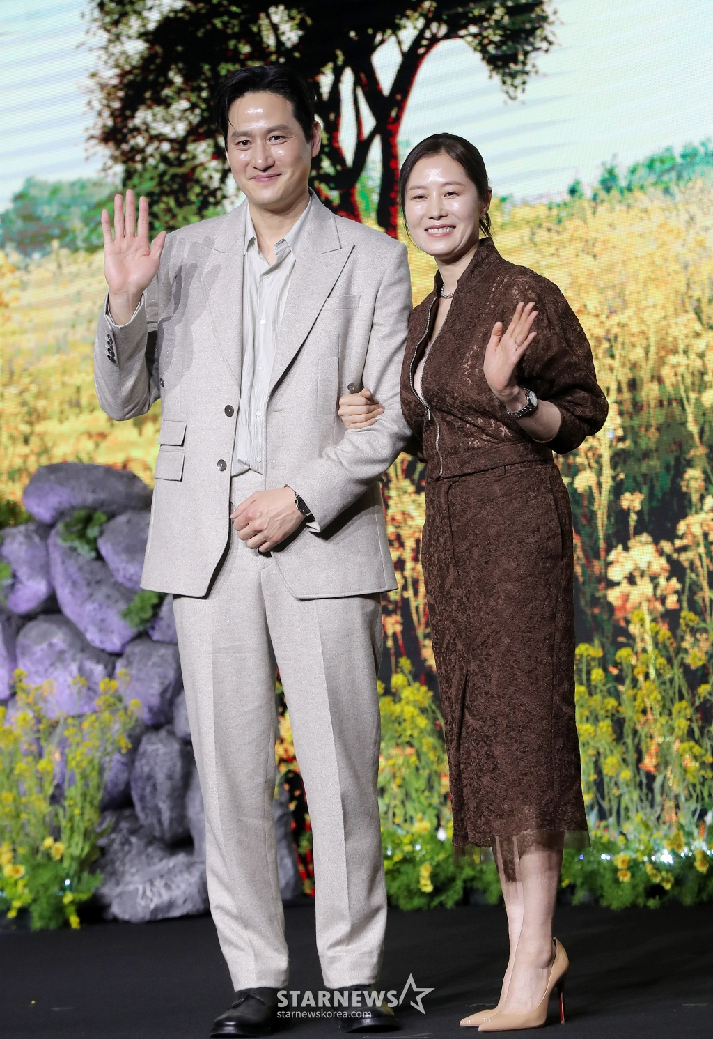배우 박해준, 문소리가 5일 오전 서울 영등포구 여의도동 콘래드 서울에서 진행된 넷플릭스 시리즈 '폭싹 속았수다' 제작발표회에 참석해 포즈를 취하고 있다.
