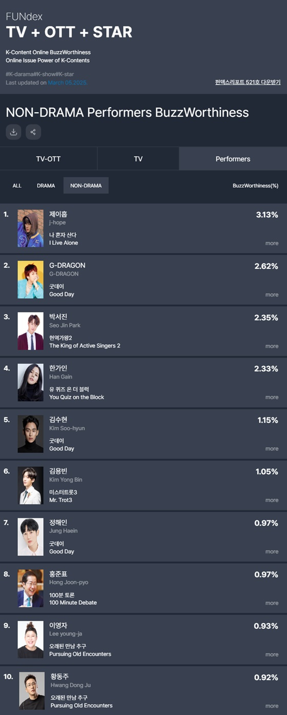 오늘(5일) 굿데이터코퍼레이션 펀덱스(FUNdex)는 2월 4주 차 TV-OTT 통합 비드라마 출연자 화제성 부문 순위를 발표했다.