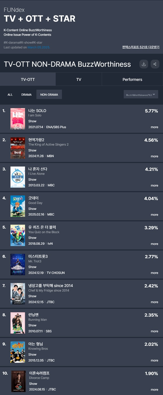 굿데이터코퍼레이션이 발표한 2월 4주 차 순위는 2025년 2월 24일부터 2025년 3월 2일까지 방송 또는 공개 중이거나 예정인 TV 비드라마와 OTT 오리지널 비드라마 그리고 각 프로그램에 출연한 출연자과 게스트를 조사 대상에 포함하였다.