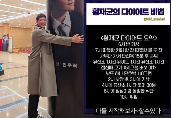 공개된 사진 속에는 '황재균의 다이어트 비법'이 적혀 있다. 6시 반 기상, 7시 따뜻한 커피 한 잔 따뜻한 물 두 잔, 사우나 가서 반신욕 15분 후 샤워, 유산소 1시간 웨이트 1시간 유산소 1시간 등 내용이 담겼다.