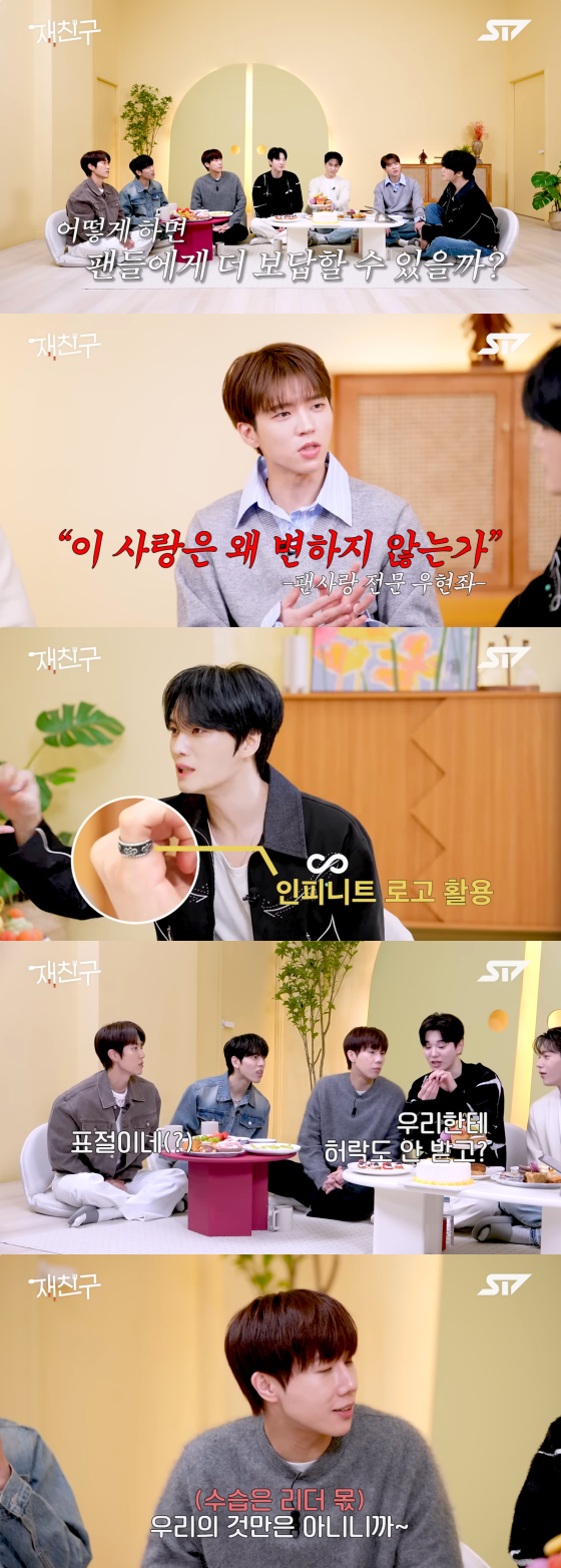 이를 듣던 김재중은 "내가 사실 인피니트한테 고마운 게 있다"며 자신이 착용한 반지를 내보였다. 이는 무한한 사랑을 의미하는 로고 각인이 새겨진 반지로, 해당 각인은 김재중의 팬클럽 베이비스를 상징한다.