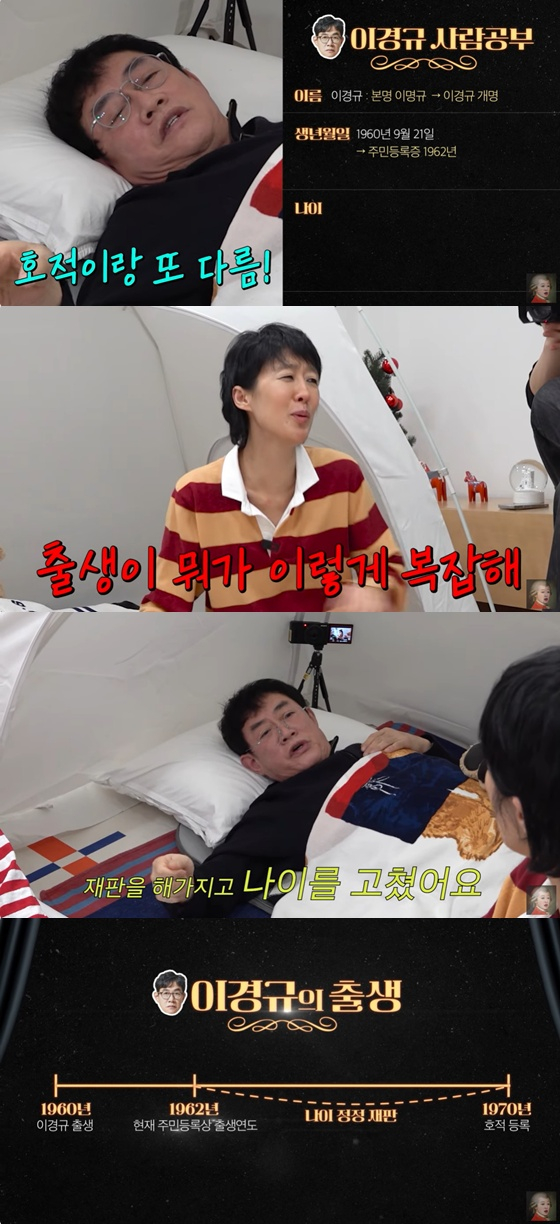 이경규는 "1960년도에 태어났는데, 주민등록증엔 1962년생으로 돼 있다. 근데 원래 호적엔 '1970년생'으로 돼 있었다. 그래서 내가 (나이 정정) 재판을 해서 고쳤다. 하지만 나이를 한 번에 많이 못 고치게 돼 있어서, 그러다 보니까 실제 60년생까지 못 줄이고 62년생으로 등록된 거다"라고 밝혀 눈길을 끌었다.