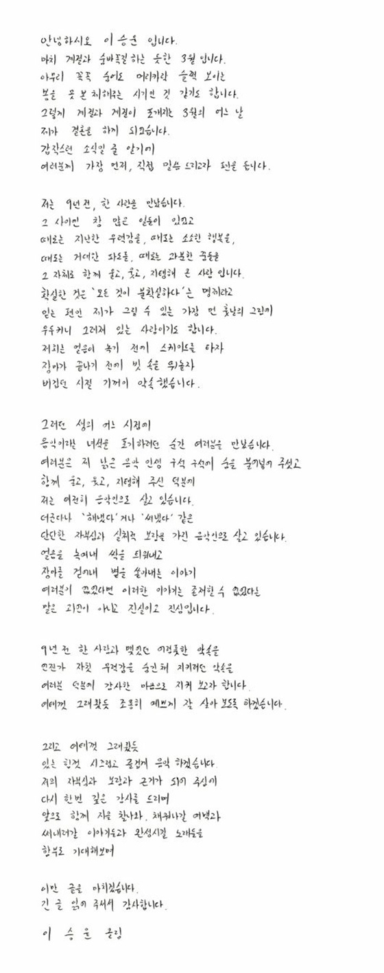 그는 "9년 전 한 사람과 맺었던 어렴풋한 약속을, 언젠가 자칫 무력감을 숨긴 채 지키려던 약속을, 여러분 덕분에 감사한 마음으로 지켜보고자 한다. 여태껏 그래왔듯 조용히 예쁘게 잘 살아보도록 하겠다. 그리고 여태껏 그래왔듯 있는 힘껏 시끄럽고 즐겁게 음악 하겠다"라고 전했다.