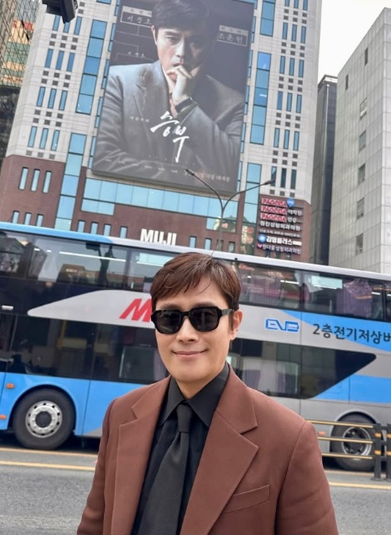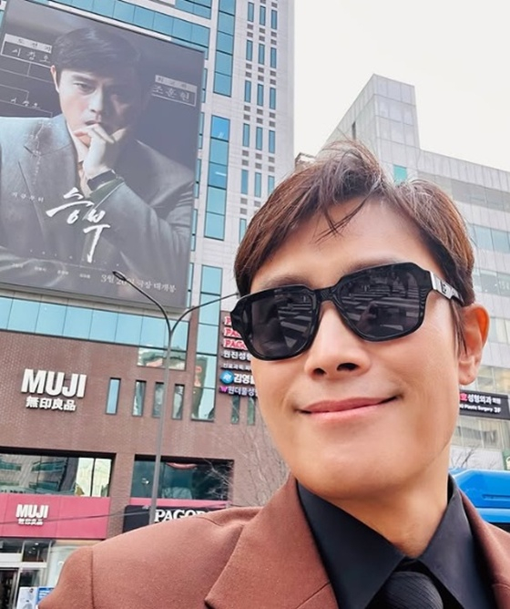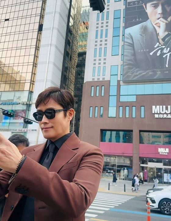공개된 사진 속 이병헌은 강남의 한 건물에 걸린 대형 광고와 셀카를 찍었다. 대형 광고판에는 영화 '승부' 포스터가 담겼다. 갈색 슈트에 선글라스까지 낀 그는 흐뭇한 미소를 짓고 있다.