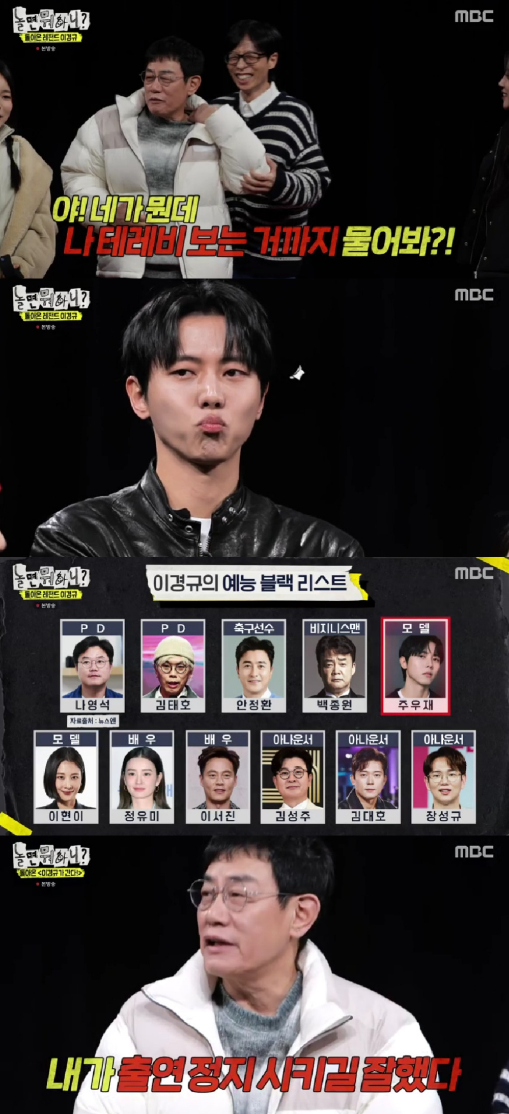 '놀면 뭐하니?'의 이경규가 '예능 블랙리스트'에 오른 주우재를 언짢아했다.