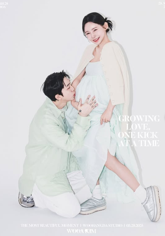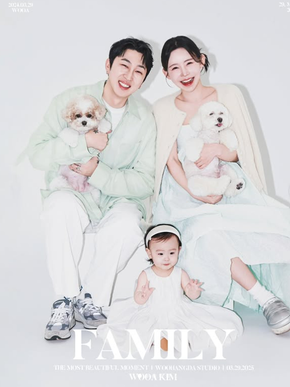 공개된 사진 속에는 둘째 임신 중인 아내와 딸, 두 반려견과 함께 가족사진을 찍고 있는 슬리피의 모습이 담겼다. 특히 슬리피는 임신 중인 아내의 만삭 배에 입을 맞추고 있어 훈훈함을 안긴다.