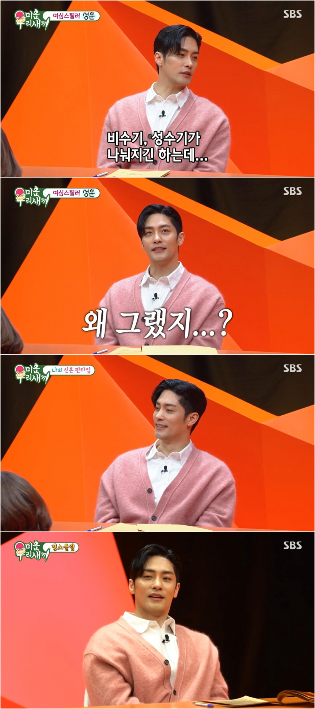이날 성훈은 유독 출연한 드라마에서 뺨 맞는 장면이 많았다며 "어차피 맞을 거면 리얼하게 가자고 서로 협의한 장면"이라고 추억을 회상해 웃음을 자아냈다.