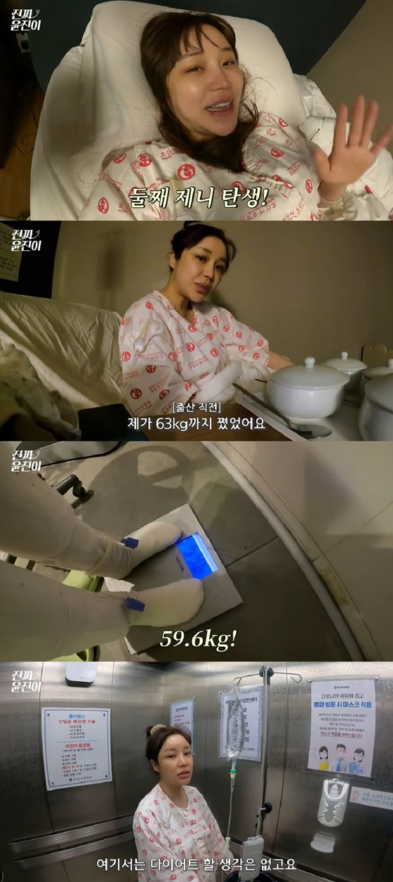 이후 윤진이는 금식을 끝내고 첫 식사를 했다. 그는 "(출산 전) 63kg가 쪘었다. 병원에서 얼마나 빠지는지 보여드리겠다. 근데 병원에서는 많이 빠지지 않을 거 같다"고 전했다.
