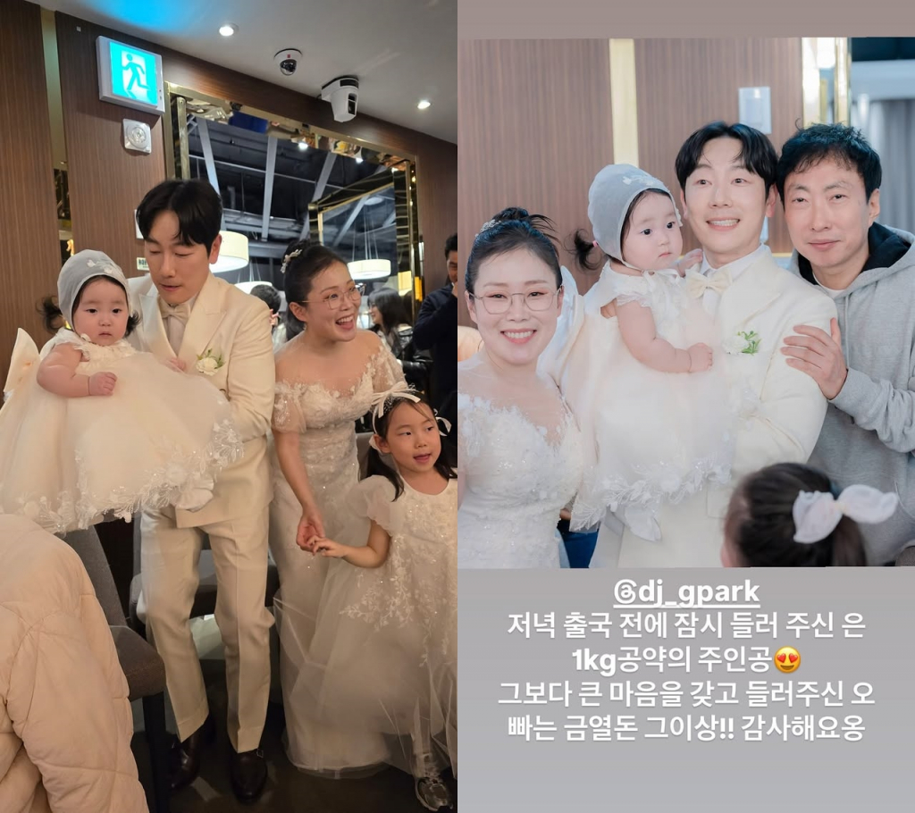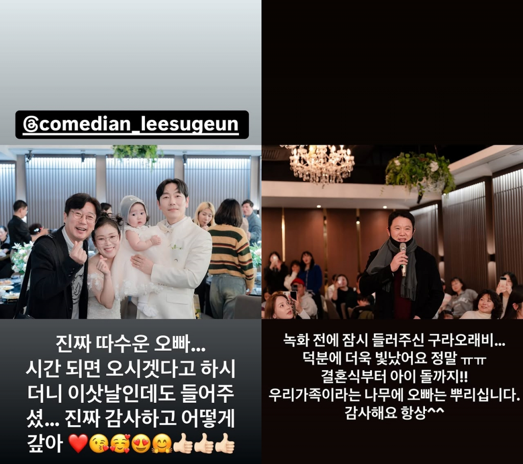 또한 김구라가 녹화 전에 방문했다며 "구라 오빠 덕분에 더욱 빛났어요 정말. 결혼식부터 아이의 돌까지. 우리 가족이라는 나무에 오빠는 뿌리십니다. 감사해요"라고 했다.