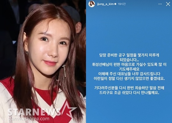 뿐만 아니라 정아는 "당장 준비한 공구 일정을 몇 가지 미루게 됐다. 휘성 선배님이 편한 마음으로 가실 수 있도록 많이 기도해 달라"라며 "이해해 주신 대표님들 너무 감사드린다"라고 알렸다.