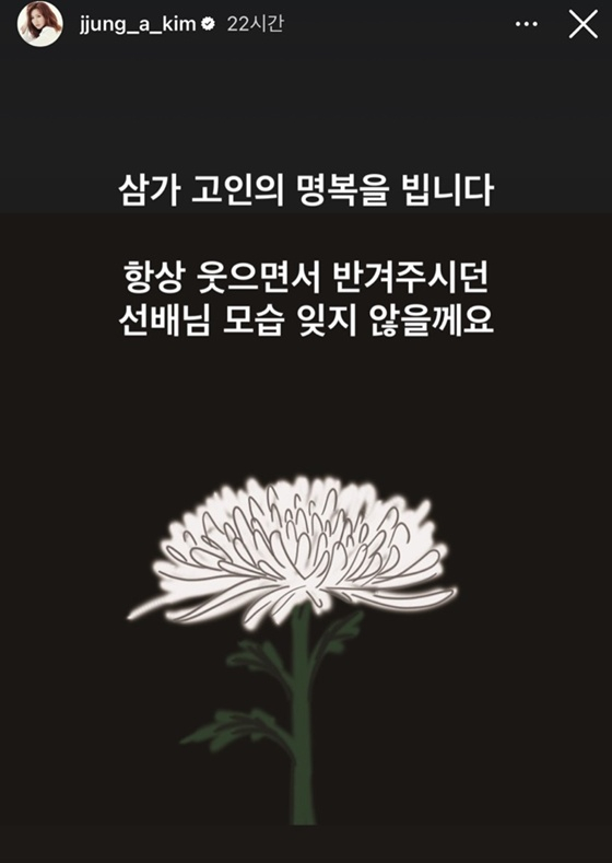 정아는 11일 자신의 인스타그램 스토리에 국화꽃 이미지를 올리며 "삼가 고인의 명복을 빕니다. 항상 웃으면서 반겨주시던 선배님 모습 잊지 않을게요"라는 추모글을 남겼다.
