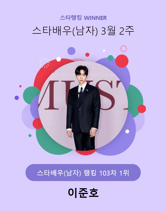 그룹 2PM 겸 배우 이준호가 스타랭킹 스타배우 남자 부문 1위를 차지했다.