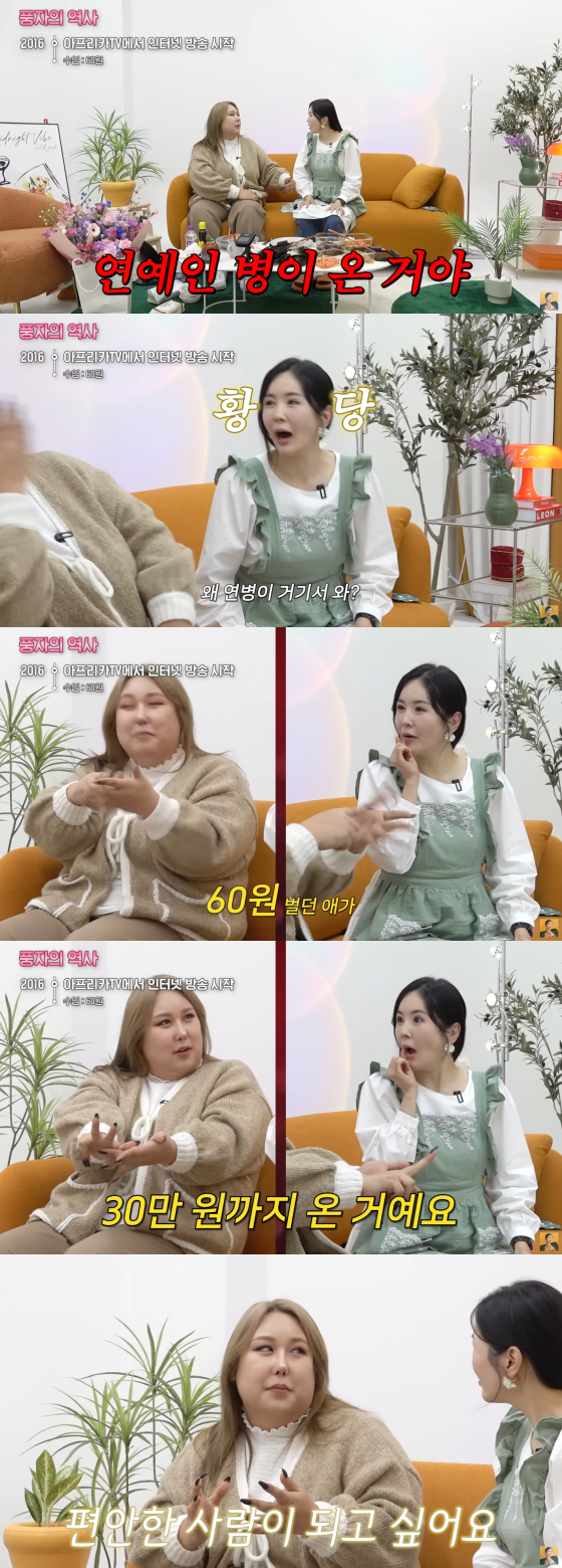 아프리카TV 인터넷 방송을 시작하게 된 계기도 언급했다. 풍자는 "엔터테인먼트 업계에 있는 어떤 분이 '내가 촉이 있는데 너는 100% 잘 된다'면서 방송을 권유하더라. 그래서 딱 방송을 시작했는데 시청자가 한 명이었다. 거의 영상 통화였다. 100원 벌었다. 수수료 떼서 60원 벌었다"고 털어놔 웃음을 자아냈다.