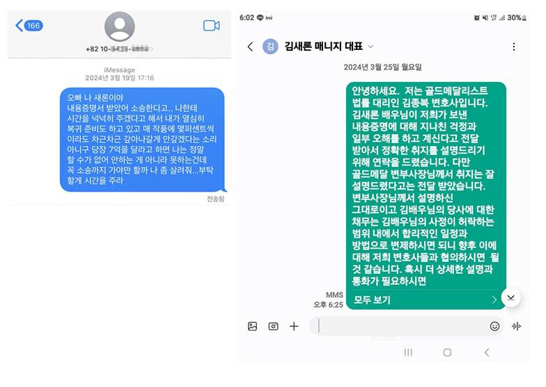 당사를 떠난 상태였던 김새론씨는 채무에 대한 법률적 지식이 충분치 못한 상태였습니다. 이에 채권자가 아닌 김수현씨에게 문자를 보냈습니다. 그러나 김수현씨는 당사와 김새론씨간의 상황을 전혀 알지 못했습니다. 당시 두 사람은 헤어진지 4년이 된 시점이었습니다. 김수현씨는 당사에 김새론씨의 문자 내용에 대해 문의했고, 이에 당사는 김수현씨에게 "상대방이 법률적 지식이 정확하지 상태에서 오해가 있어 보이니 전문가의 확인없이 이런 문제에 답변하는 건 적절하지 않아 보인다. 회사가 법률전문가와 함께 김새론씨 소속사와 연락해 오해없도록 원만히 해결하겠다"고 답했습니다. 그리고 첨부한 바와 같이 내용증명의 취지에 대해 설명했습니다.