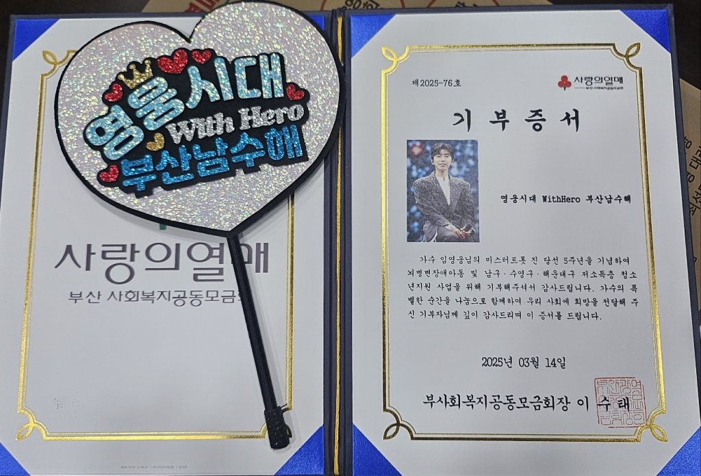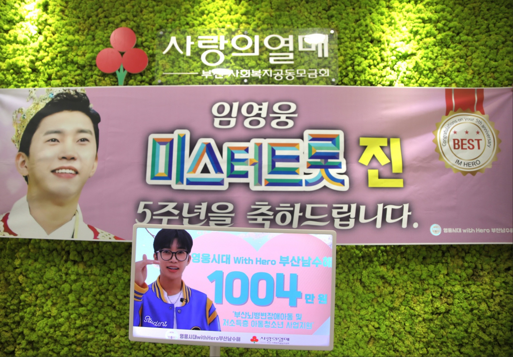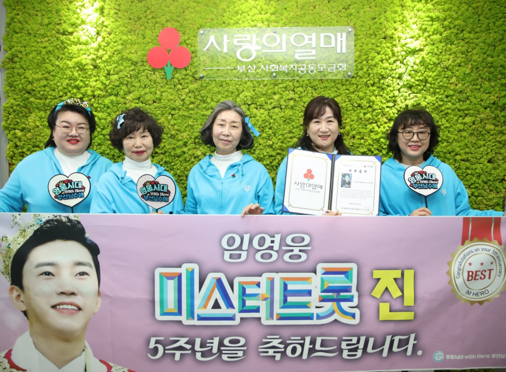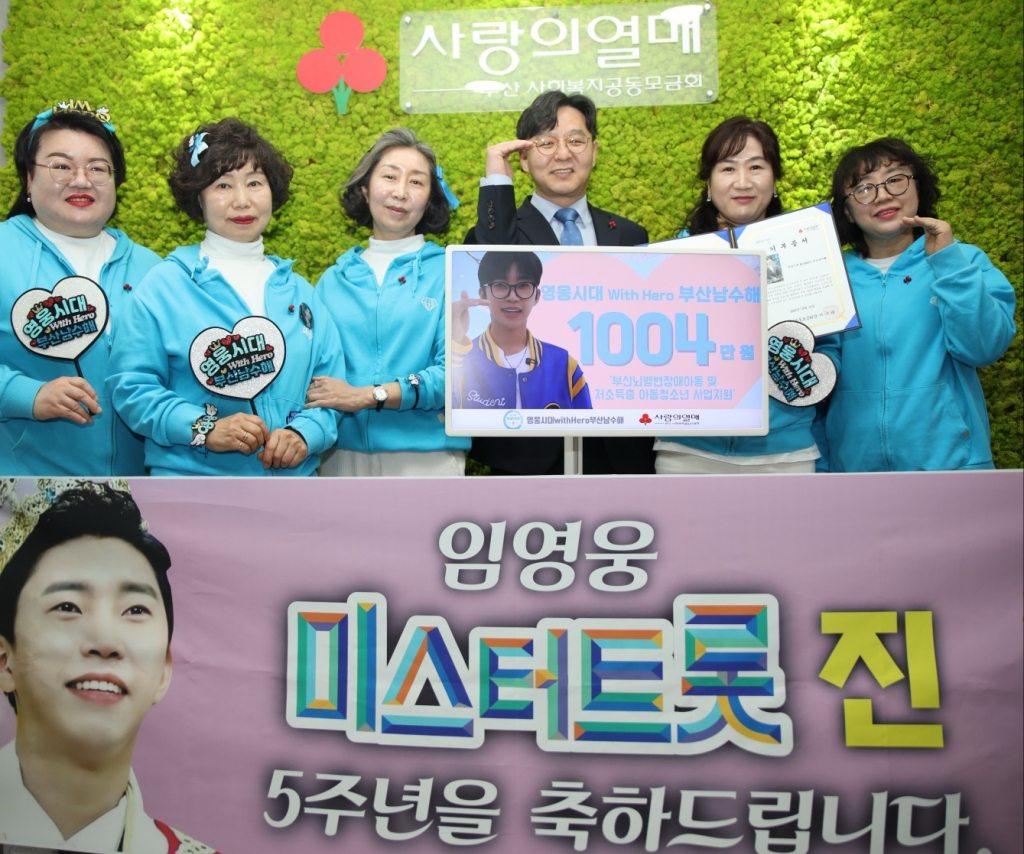임영웅 팬클럽 영웅시대WithHero부산남수해는 3월 14일 임영웅의 '미스터트롯' 진 5주년을 맞아 부산사회복지공동모금회(회장 이수태·부산사랑의열매)에 이웃돕기 성금 1004만 원을 전달했다.