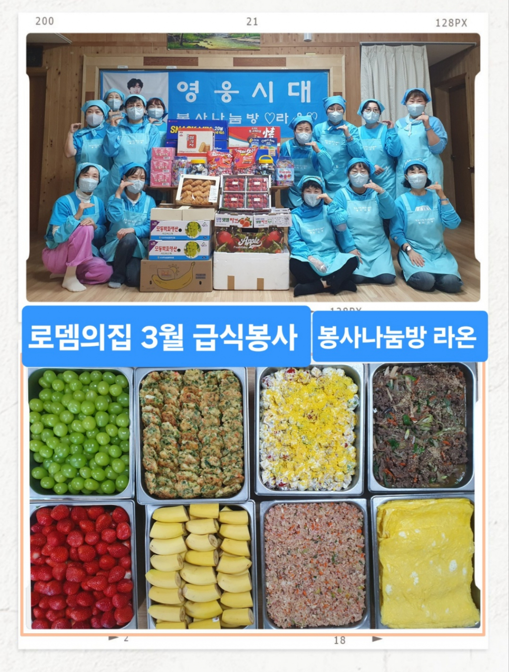 임영웅 팬클럽 영웅시대 봉사 나눔 방 '라온'은 3월 15일 경기도 양평 로뎀의 집에서 45번째 급식 봉사와 기부(180만 원)를 진행했다.