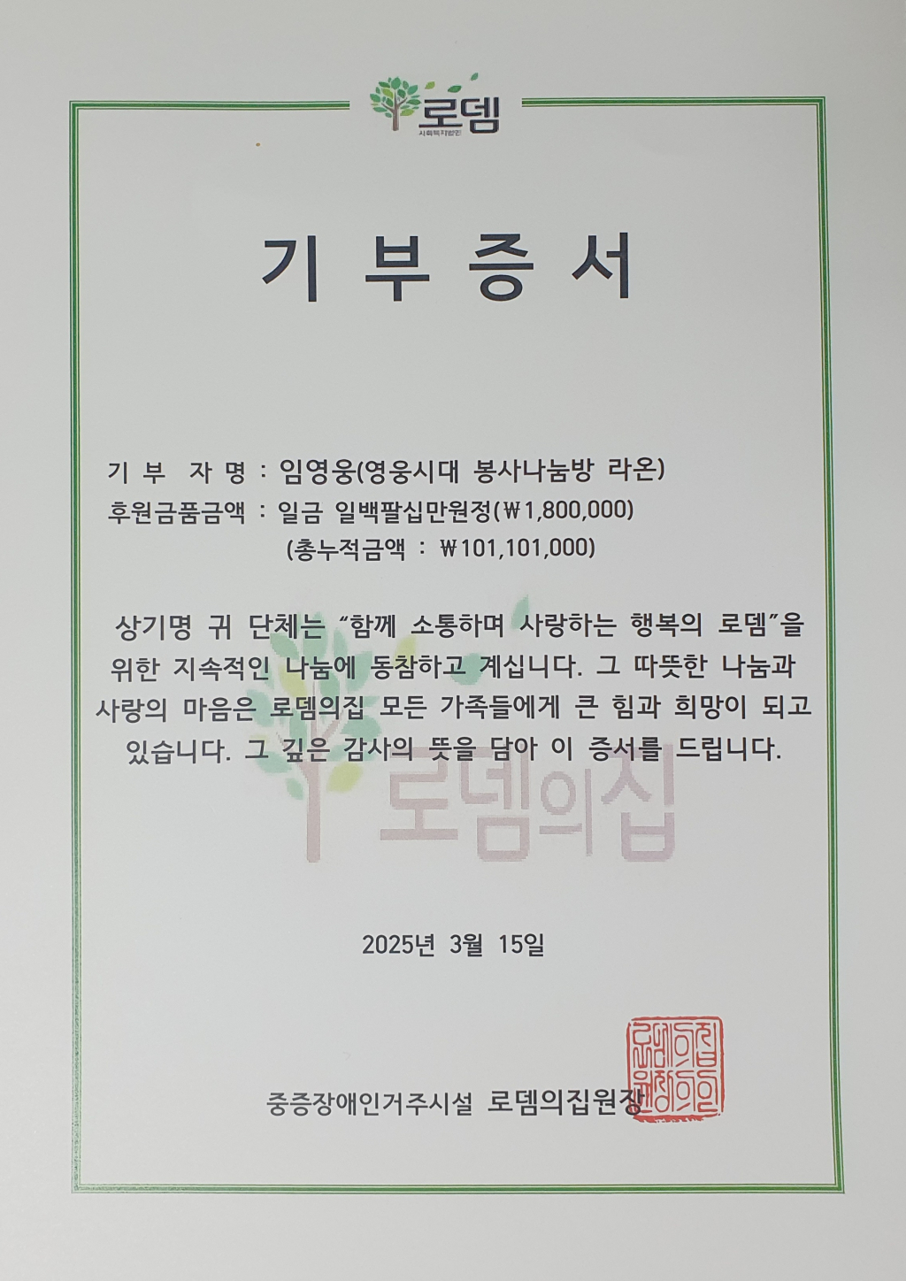 '라온'은 중증 장애아동들이 거주하는 로뎀의 집에 매달 150만 원의 급식비와 다양한 물품들을 후원하고 직접 음식도 만들어 제공하는 주방 급식 봉사도 진행하고 있다.